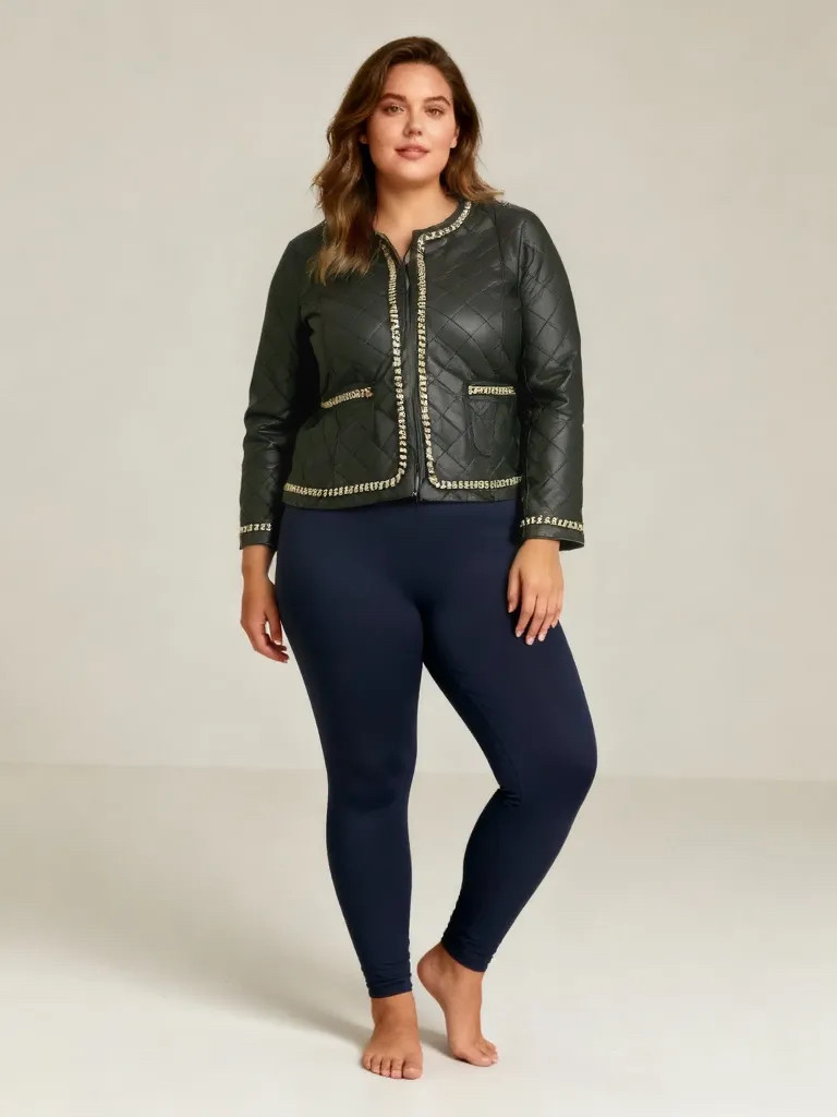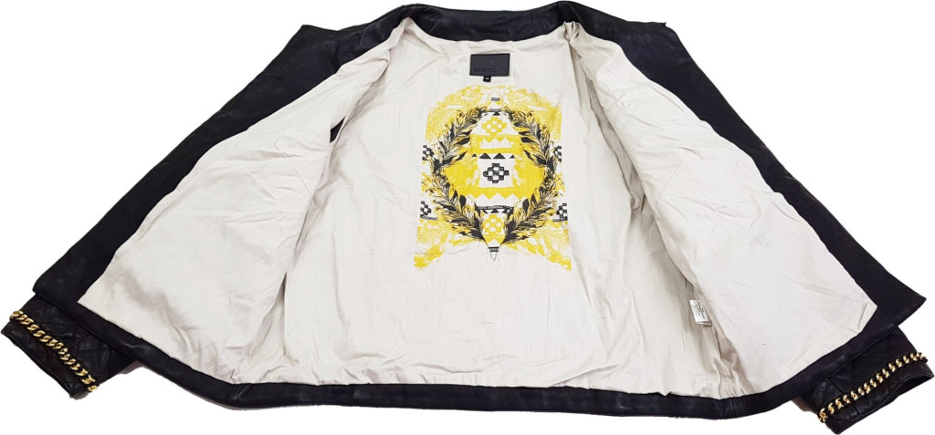 Rávarrt lánccal díszített, elöl a nyakánál összekapcsolható, vékonyan bélelt, lezser műbőr kabát.