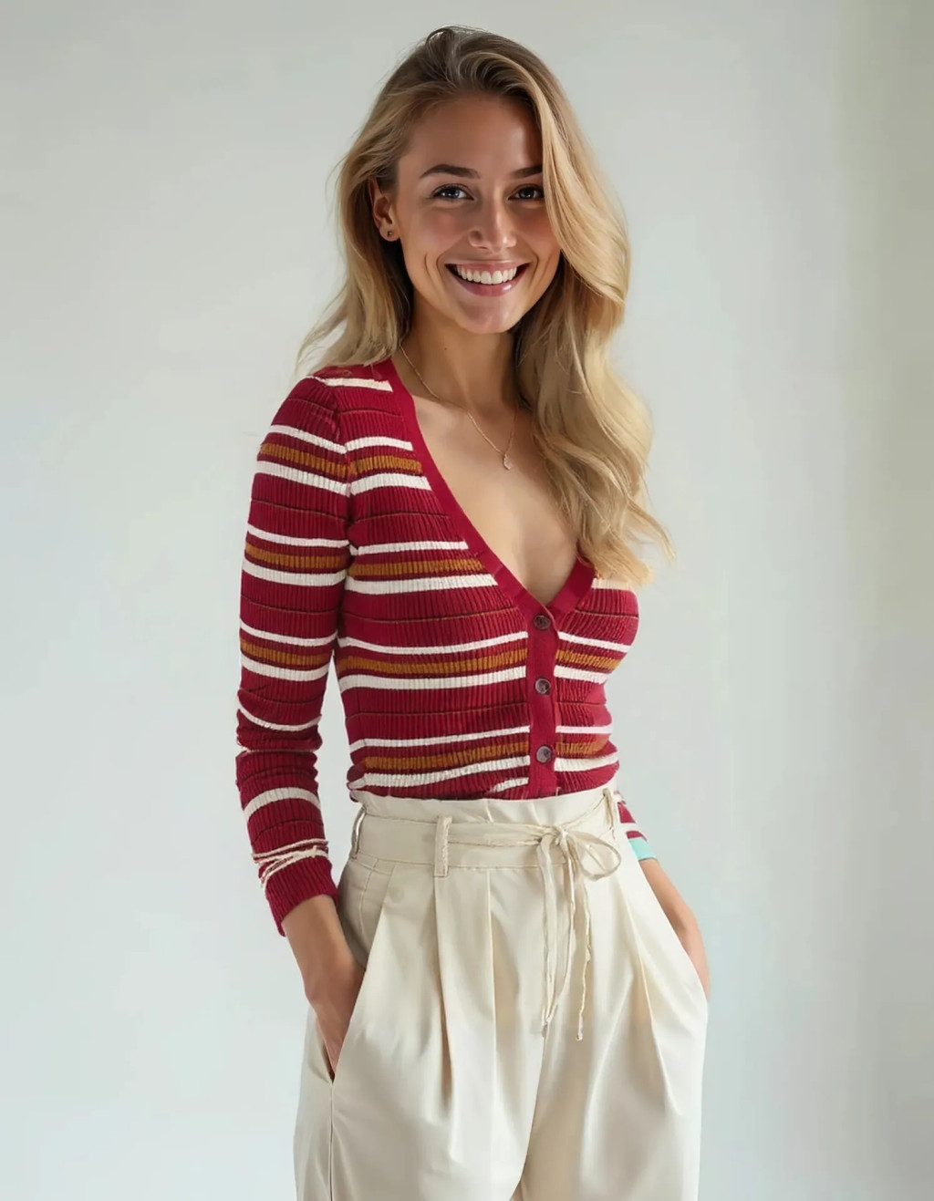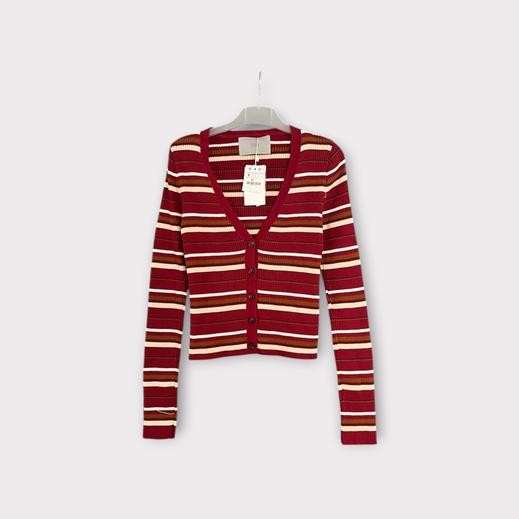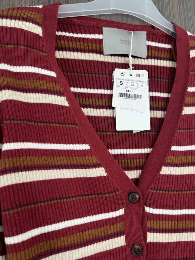 Bordázott anyagú, csíkos női kardigán S-es méretben.