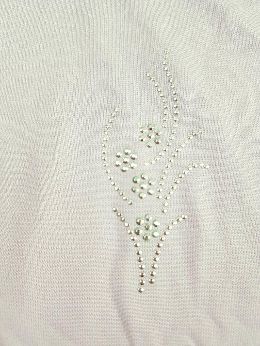 Oldalt felvágott felső. Strasszkövekből kirakott apró virágok díszítik. Anyaga 70% viszkóz, 30% poliészter. Címkéjén 44-es méret szerepel. Hossza: 65 cm, szélessége: 50 cm.