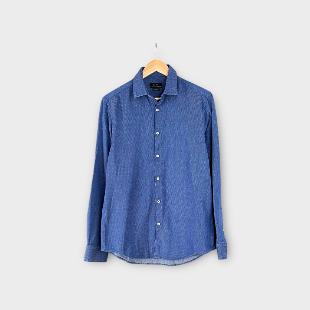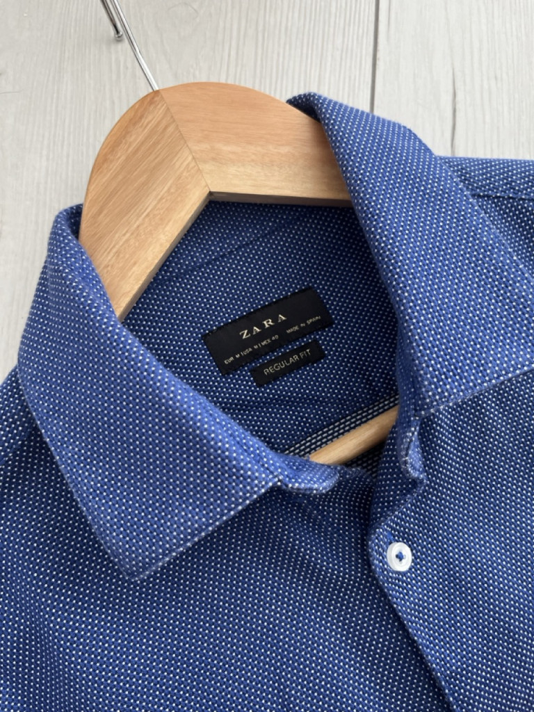 Kék alapon apró fehér pöttyös ing M-es méretben.